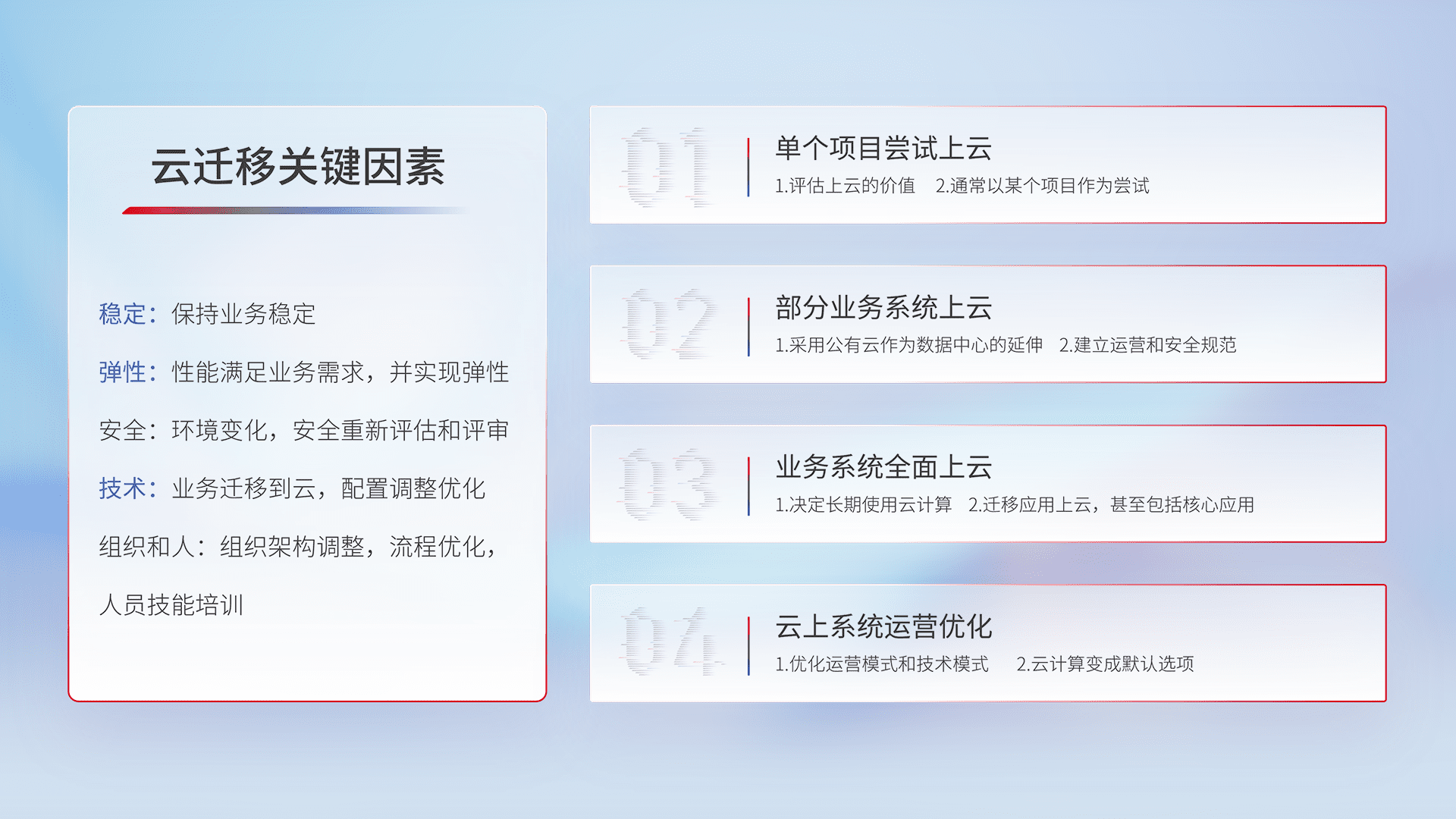 结合实际业务,,从规划设计、、云平台选型、、、、云原生改造、、、、数据迁移、、、集成交付,,,迁移全过程为客户识别最佳上云路径,,,,做好风险识别管理,,,,设计网络架构、、、身份权限、、安全审计合规、、、、操作审计、、日志审计、、监控告警策略、、、、多站点容灾设计等,,对云上基础设施进行整体规划,,,提升IT治理水平,,,,以满足弹性、、、高可用、、、高性能的需求。。