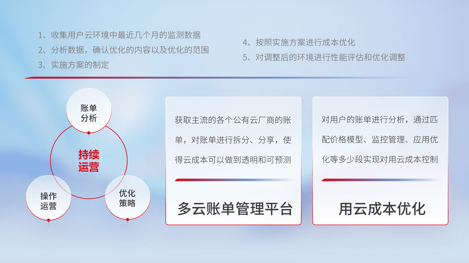 通过多云纳管,,以统一的资源数据模型把客户的云资源进行抽象和封装,,,进而实现对多云资源的统一操作,,,,保障云资源管理的可靠性、、、稳定性与可用性。。量身定制化运维内容,,,配置、、、、开发运维、、补丁管理、、、备份、、监控、、、、认证和访问管理、、、、审计和日常巡检等,,,,保障在用云过程中的可靠度,,稳定度以及高可用率。。。。